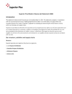 Superior believes that acting in a socially responsible and sustainable manner benefits all our stakeholders and will create long-term shareholder value. Our strong governance practices ensure that we operate in a safe, reliable, and environmentally responsible way while providing low carbon energy solutions to our customers. More information about our sustainability performance and initiatives can be found in our annual Sustainability Reports below.
